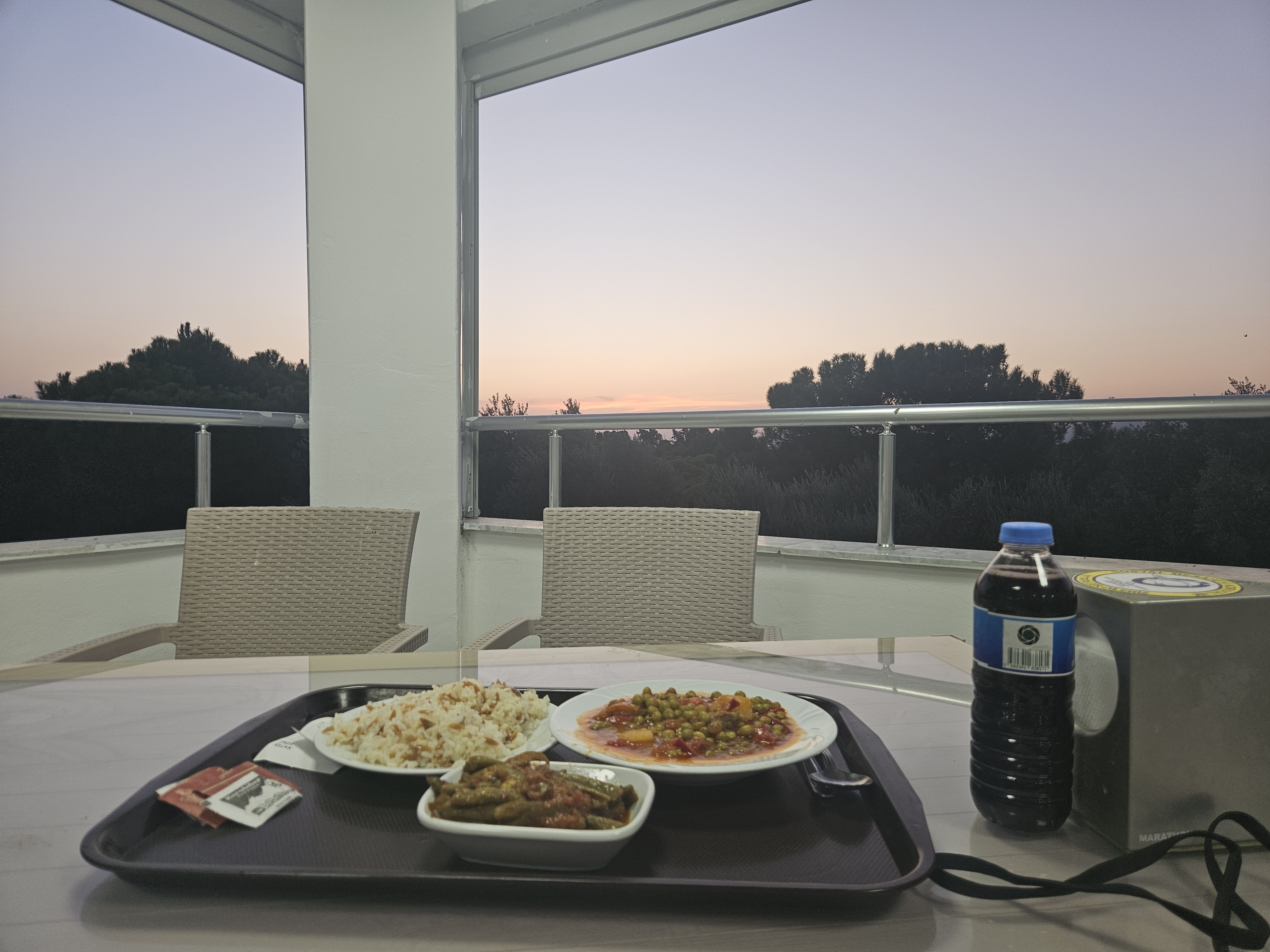 Etli bezelye, taze fasulye, pilav, aroma eşliğinde.